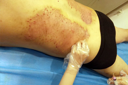 治疗前:腰上可见很多小水疱,少数有破裂糜烂,常有烧灼和痛痒感。