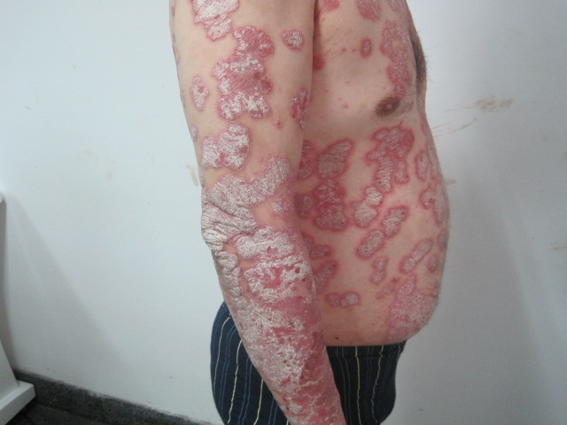 57岁的张大爷在2009年得了关节炎型牛皮癣,开始是皮肤上有些红点,脚上关节疼痛。后来越来越重,发展到皮肤又红又肿、层层脱屑,全身关节疼痛、肿大变形。得病以后,他曾在附近的皮肤病医院治疗,由于方法不当效果不佳,过度使用激素还加重了病情。