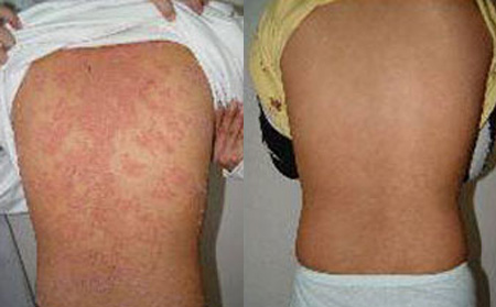 在大家的盛情劝说下,被灌了几杯,当天晚上睡觉时满脸通红,手脚滚烫,起了一身的疹子。第二天开始全身一片…