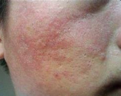 4. 螨虫性皮炎:患者皮肤变粗糙,有脱皮现象。在夜间面部会有瘙痒感。面部多油,毛孔变粗大,鼻周毛孔有黑头并增多。青春痘反复发作,鼻上痤疮反复发作,毛血管扩张,皮肤开始增生性肥厚,呈“橘皮状”红肿。前胸、后背生出红色小疙瘩。还出现断发、头发分叉,头皮屑增多等等。