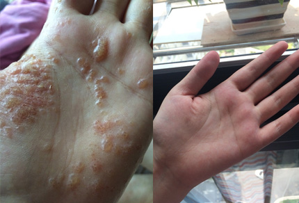 治好湿疹,一夜安稳到天亮。刘女士,今年50岁了,患湿疹已经十几年,据刘女士说,在她刚生完宝宝的第二年的时候就有了,手掌出现小丘疹,刘女士也没太在意,就随便到药店买点药膏涂涂,后来就变得严重起来,皮肤开始渗液、干燥、结痂、粗糙肥厚与裂口,更令刘女士受不了的是皮肤开始钻心的痒,特别是到晚上,躺在床上,奇痒无比,弄得自己老是翻来覆去,连自己的老公都难以入睡。白天也不能好好的干活,就这样,刘女士经常到药店买药治疗,可是病情还是反反复复,一直不能,其实期间,也有到大医院看过,吃过的药不知道有多少种,花了近万元的医疗费。